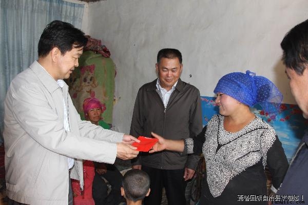 州委书记彭家瑞(左一)给七个星镇霍拉山村特困户送去了慰问金
