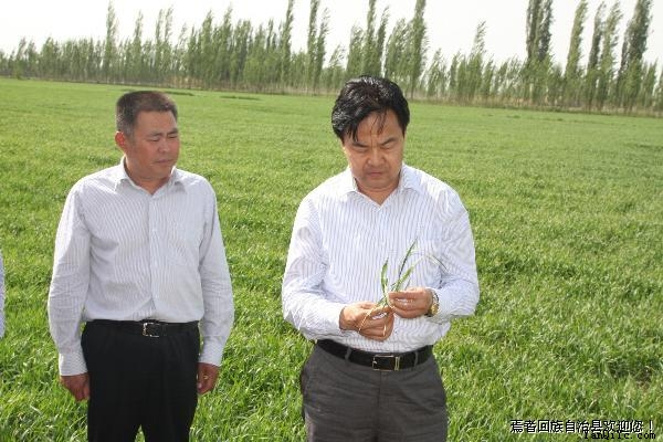 州委书记彭家瑞(右)在县委书记胡雁(左)的陪同下正在查看千亩高标准节水滴灌小麦长势情况