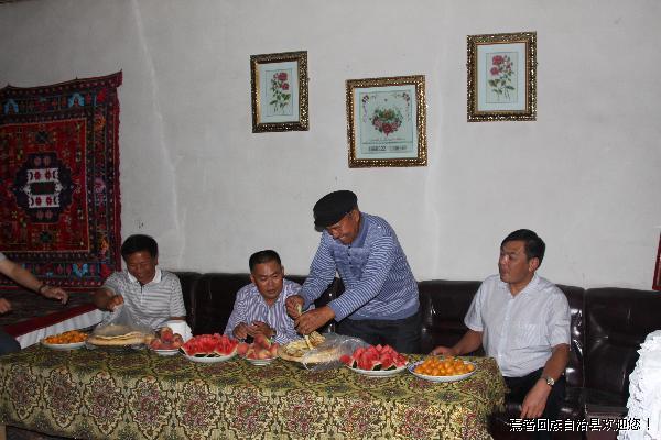 七个星镇霍拉山村的买买提·阿吉今年62岁了,1984年加入中国共产党,一家四口人,有20亩地,老伴常年体弱多病,农作物收成低,生活较为困难。胡雁走进他家的小院,核桃、苹果、杏子挂满枝头,家禽满圈。他家的安居富民房正在建设。胡雁为他家增收出谋划策。建议新房子盖好以后发展庭院经济,利用果树、家禽等现有的条件发展农家乐,日子会好起来的。胡雁要求七个星镇领导,利用霍拉山地理资源和环境优势发展旅游业,积极引导村民发展庭院经济,走经济可持续发展的道路,让村民尽快富裕起来。